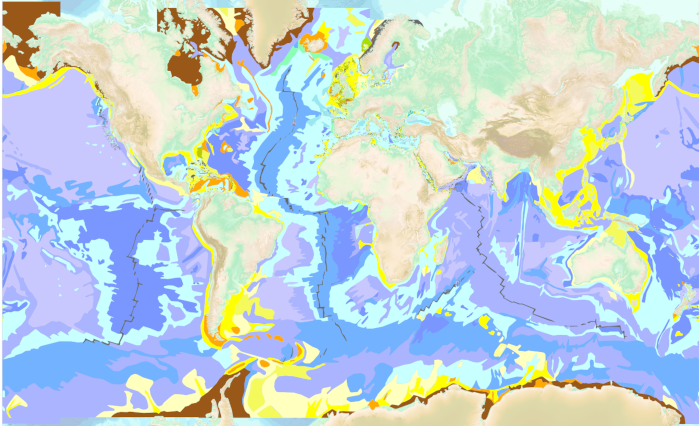 The “World Seabed Sediment Map” product contains geo-referenced digital data, describing the nature of the sediment encountered in different seas and oceans of the world. The objects are all surface areas and the description of an object includes in particular the nature of the sediment including rock-type bottoms.